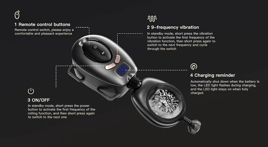 Function: 9-frequency stroking, 9-frequency vibrating, 10M Remote Control